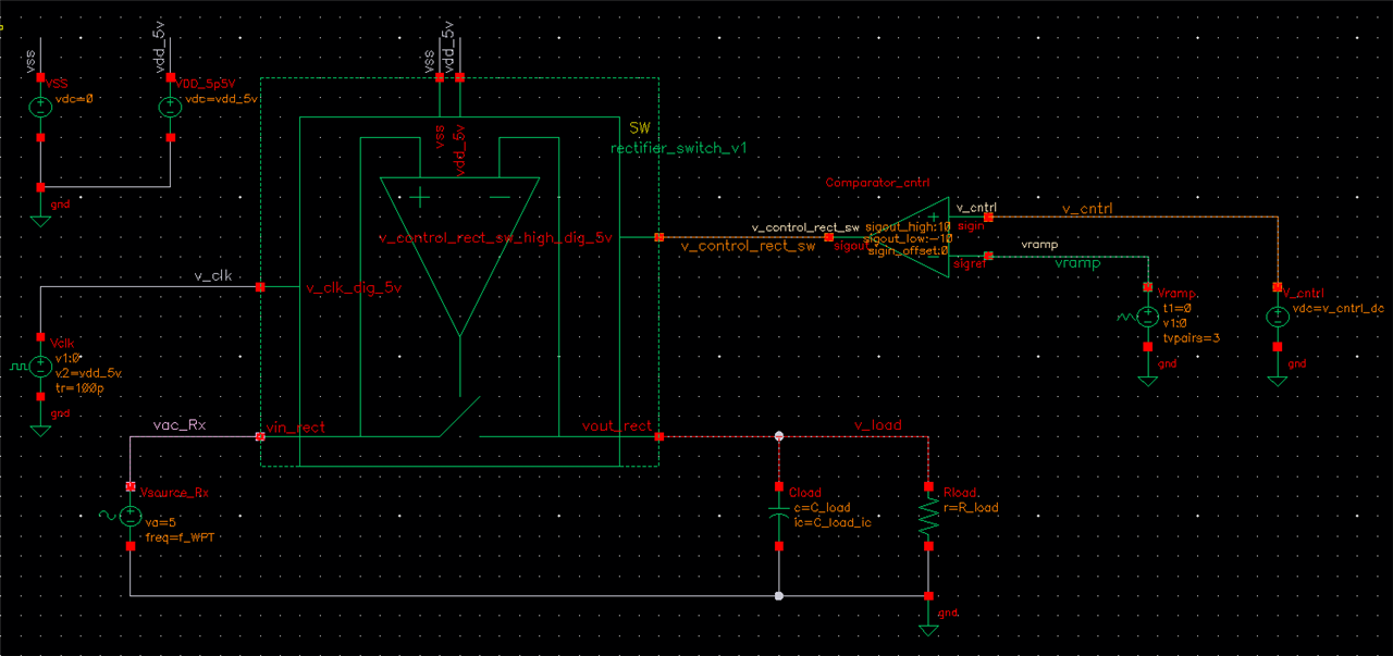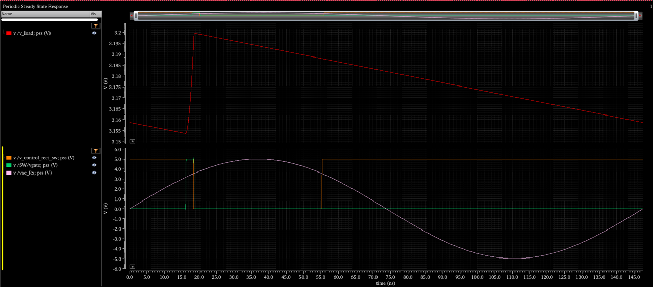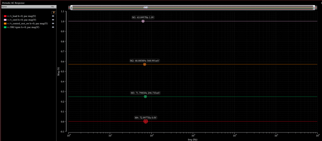 I have designed a simple rectifier with a switch (switch from analogLib) that turns on when the output voltage (v_load) intersects the AC signal and and turns off when the signal from PWM generator (implemented as a vcvs comparator, comparing a ramp signal and a dc signal - v_cntrl) is low. PSS gives steady state waveforms as expected. However, PAC gives 0V at v_load. For PAC the source V_cntrl has its PAC magnitude set as 1.