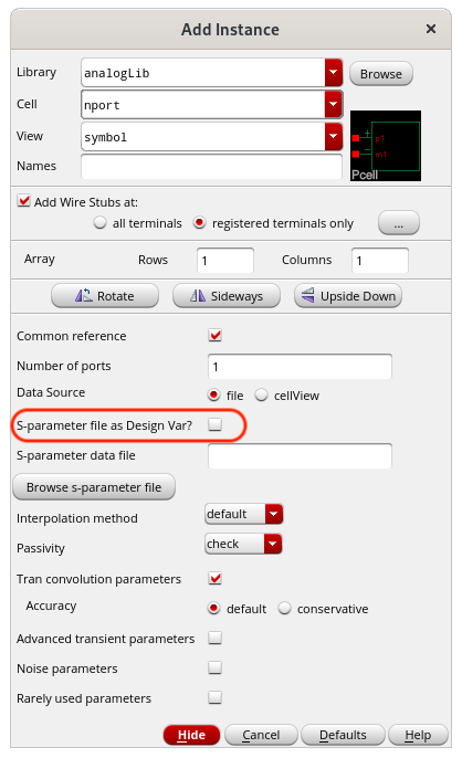 I'm looking for a solution to vary the sparameter files used for my n2port instance in Cadence simulation. Ideally, I can sweep over multiple files like any other parameter.