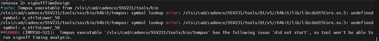 **ERROR: (IMPESO-521):  Tempus executable '/vlsi/cad/cadence/SSV231/tools/bin/tempus' has the following issue 'did not start', so tool won't be able to run signoff timing analysis.