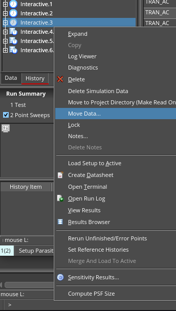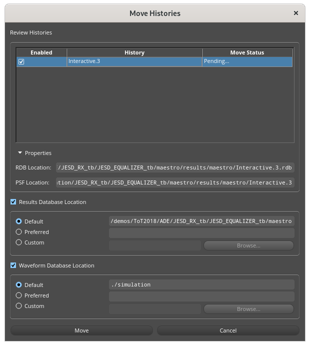 Well, you need the actual history entry to exist - either in the cellView itself or in the simulation directory (if it's an "RO" history) - you can move a history from the cellView using the "Move to Project Directory (Make Read Only)" menu or back using "Move to Cellview (Make Writable)" menu item in the history tab. Then you can use the form above to move the results database (rdb) and waveform (psf) around.