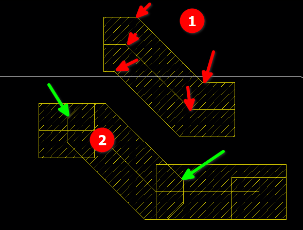 The created path using dbCreatePath command for the top (no. 1 on the figure below) trace doesn't pass DRC check because of off grid errors in the parts where the path bends - specifically the outer points the value of which I can't edit. The track start, intermediate and end points are on grid, ex. (0 0) -> (1 0) -> (2 1) -> (3 1). The code example is given below (the synthesis part works fine, the coordinates here are just a bunch of variables, their value doesn't really matter...).