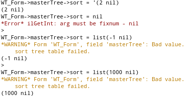 myTable->sort is nil. If you click on a sortable column 1 or two times it will sort it either on ascending or descending order, while myTable->sort will become '(colNum t) or '(colNum nil). I was expecting that I can simply feed the original property back to nil and all sorting will be gone or push it out of bounds, but an error/warning is produced: