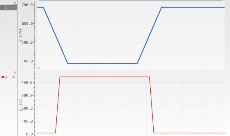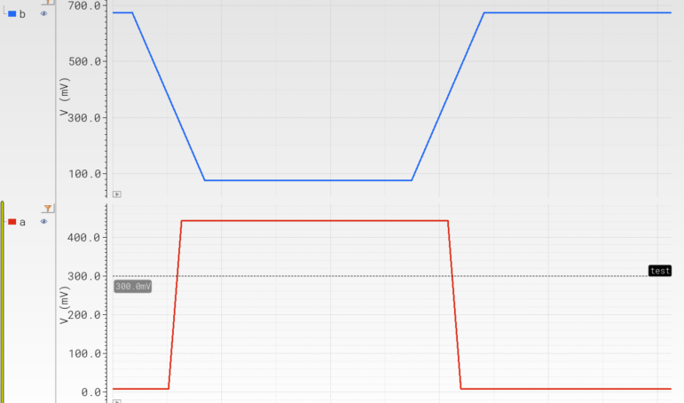 The example: there are two waveforms, each is placed in its separated strip, see image below, signal names: a (red, bottom strip), b (blue, top strip)