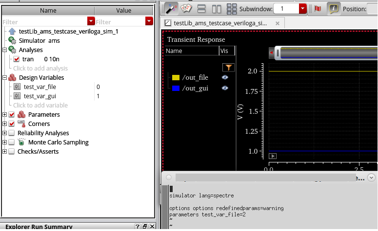 Testcase VerilogA testcase_veriloga_sim.I0: variable test_var_gui value passed is 1.000000