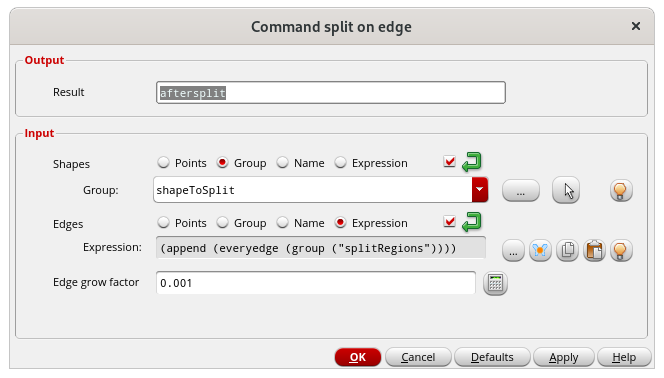 ?parameters (result (lvalue nil ?valuep t ?requiredp t ?isExpression t ?keyword t) shapes (geo (geo grow 0 type "Group" points nil group nil name nil net nil expression nil) ?lazyp nil ?valuep t ?requiredp t ?isExpression t ?keyword t ?help "Shapes to split") edges (geo (geo grow 0 type "Group" points nil group nil name nil net nil expression nil) ?lazyp nil ?valuep t ?requiredp t ?isExpression t ?keyword t ?help "Edges to use to split shape on") edge_grow_factor (float "0.001" ?valuep t ?requiredp t ?isExpression t ?keyword t ?help "Small dimension used to grow edges for chopping")))