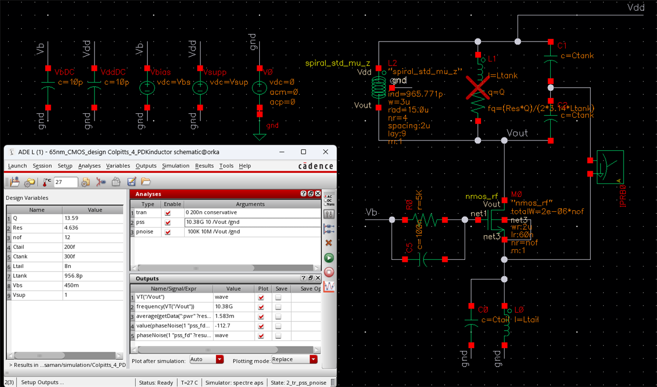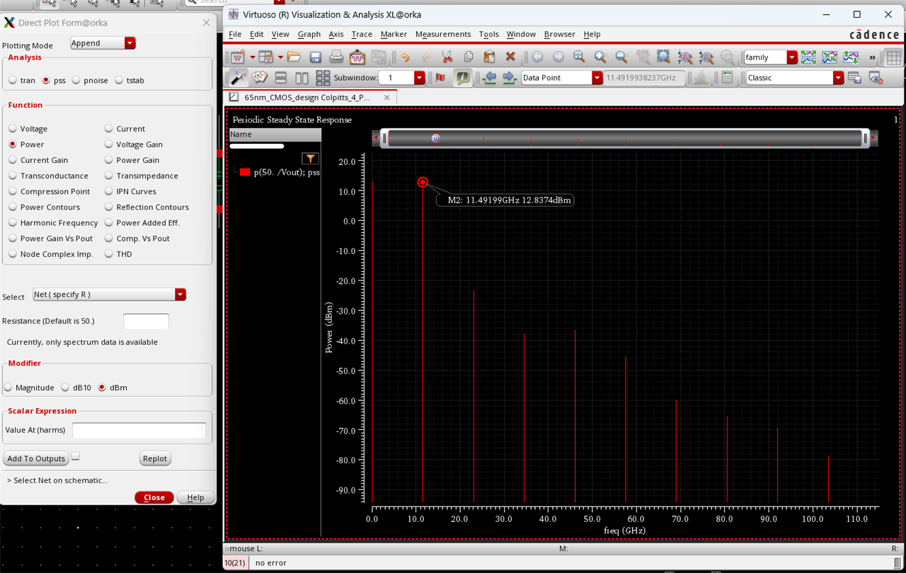 As you can find in the attached image, I am trying to simulate a Colpitts oscillator. However, using pss analysis it shows a high output power.