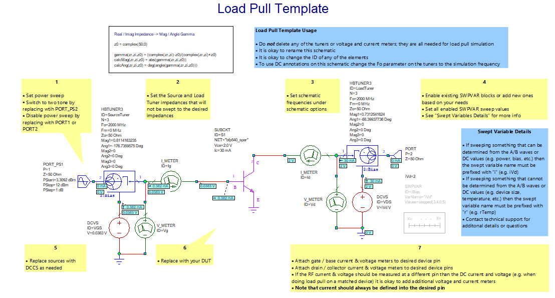I recommend you take a look at 3 examples, and you should then be totally set up for load pull with AWR.  Start with  "Simulated_Load_Pull.emp".  Then take a look at both examples that deal with the main dealers that provide load pull items.  These two are "Focus_Load_Pull.emp" and "Maury_Load_Pull.emp"