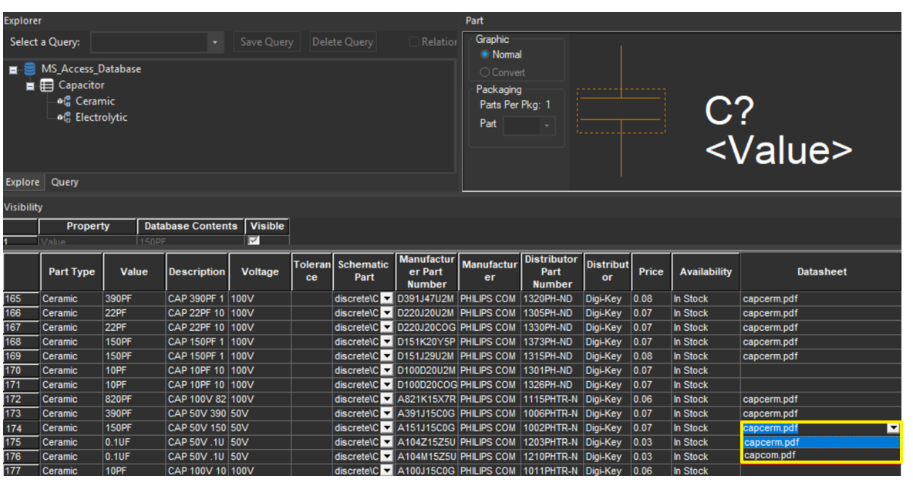 In the CIS part selection window, all database fields are shown as standard text fields, except for “Schematic Part” and “PCB Footprint”.
