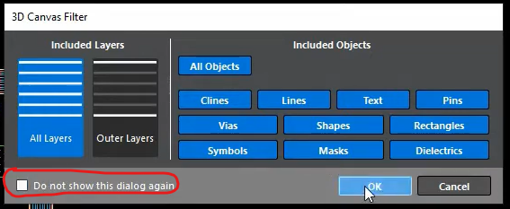 Hi Starbuck53, when you select "Do not show this dialog again"  , "hide_unified_filter_dialog" variable got enabled in the Setup > User Preferences. So if you want to enable this dialog box again, go to Setup > User Preferences > Display > 3D and uncheck this variable. Apply the changes and reinvoke 3D canvas .You should be able to see this again.