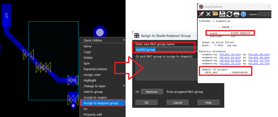 Do this using the right mouse button over a route keepout shape, and choose “Assign To Keepout Group”.