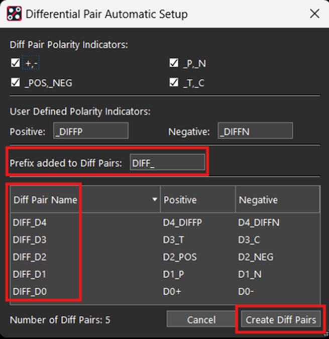 5. Add a prefix to the Diff Pair Name if desired. Click the Create Diff Pairs button to automatically create the differential pairs.