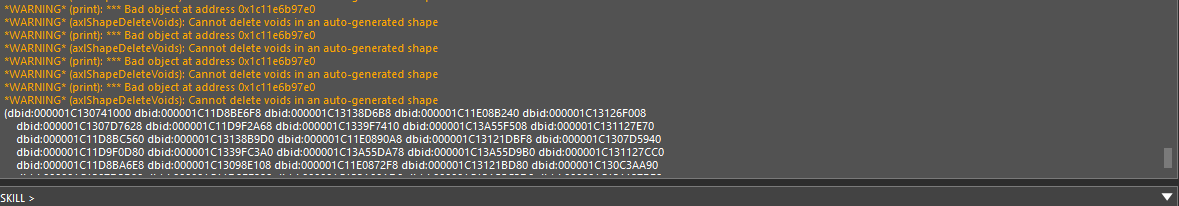 Hi mahimag , Yes i'm using it to delete these Advanced degassing holes which were placed on the CONDUCOTR Class, using the shape degassing(image attached) tool, if i use axlShapeDeleteVoids() it gives out a warning(image attached). This will only work for Manually placed voids.