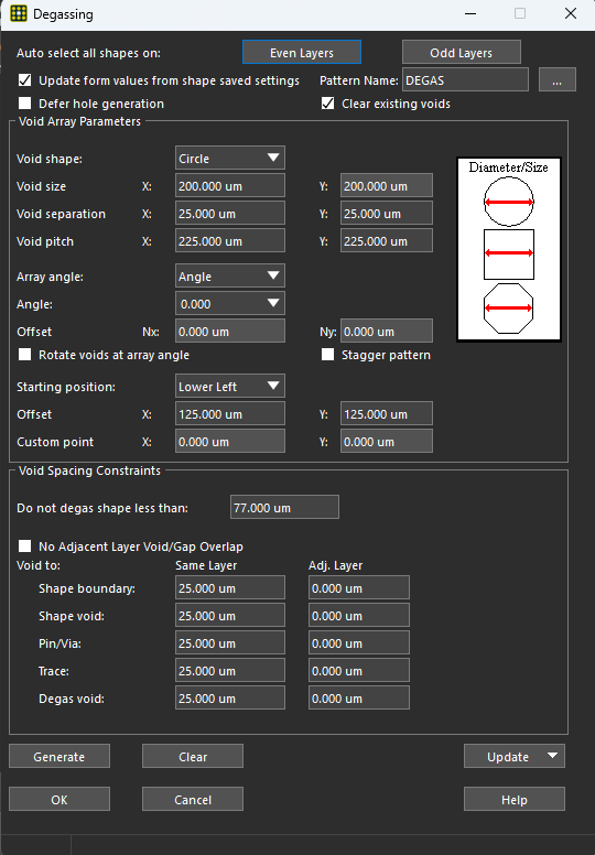 I'm trying to delete degas voids that are auto generated by Shape Degassing tool in APD using Skill script, for which i'm using this function axlShapeEraseDegassingHole , the arguments required are shape dbid and location of the holes,