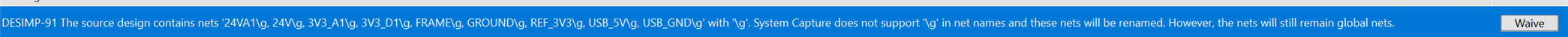 many thanks again for your reply. I would like to define an action which content the TCL Commands to waive some general warnings after Migrating DE-HDL Designs to Allegro X System Capture automatically such as "System Capture does not support \g in net names and these nets will be renamed. However, the nets will still remain Global nets", "Voltage property value has not been specified on net `24V which is connected to a power or ground symbol. Add voltage values for the net in the `Properties` tab", "Color applied to custom texts on page border in the source design will be ignored because the color does not match the page border symbol color. The page border symbol color will be applied to the custom text" and so on instead of click the waive Button to waive them manually within Allegro X25.1(for 23.1 System Capture there is currently no such Waive Button as 25.1 in Violation Window available).