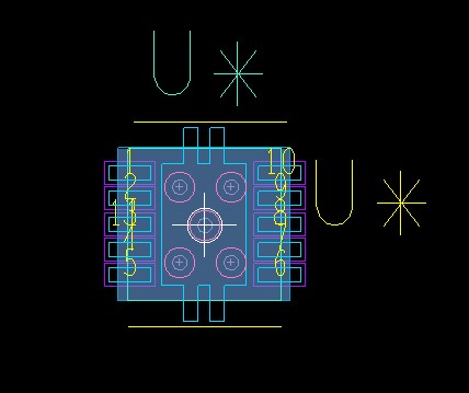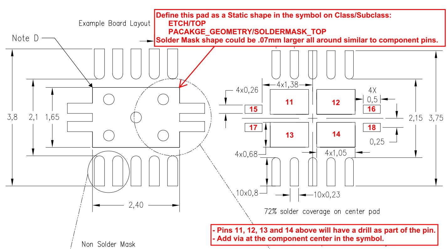 To have better control and to manage these thermal features I attempt to add them as pins so they can be easily modified to limit the amount of Static Shapes at the symbol level.  I define two Static shapes in the symbol to form the combined Top Etch and Solder Mask Pads. In addition to the 10 component pins in the device I add 8 pins, four small rectangular pins on the edges and four larger rectangular pins under the device, which define the Solder paste and drive connectivity to the thermal pad shape.  The four pins under the device have a drill in the middle, a rectangle pad on the top and round pads internal.  Finally, add one via at the center of the component in between the four larger rectangular pins.  NOTE: These additional 8 pins will require to be driven from the netlist and will be tied to a common net, most likely GND.