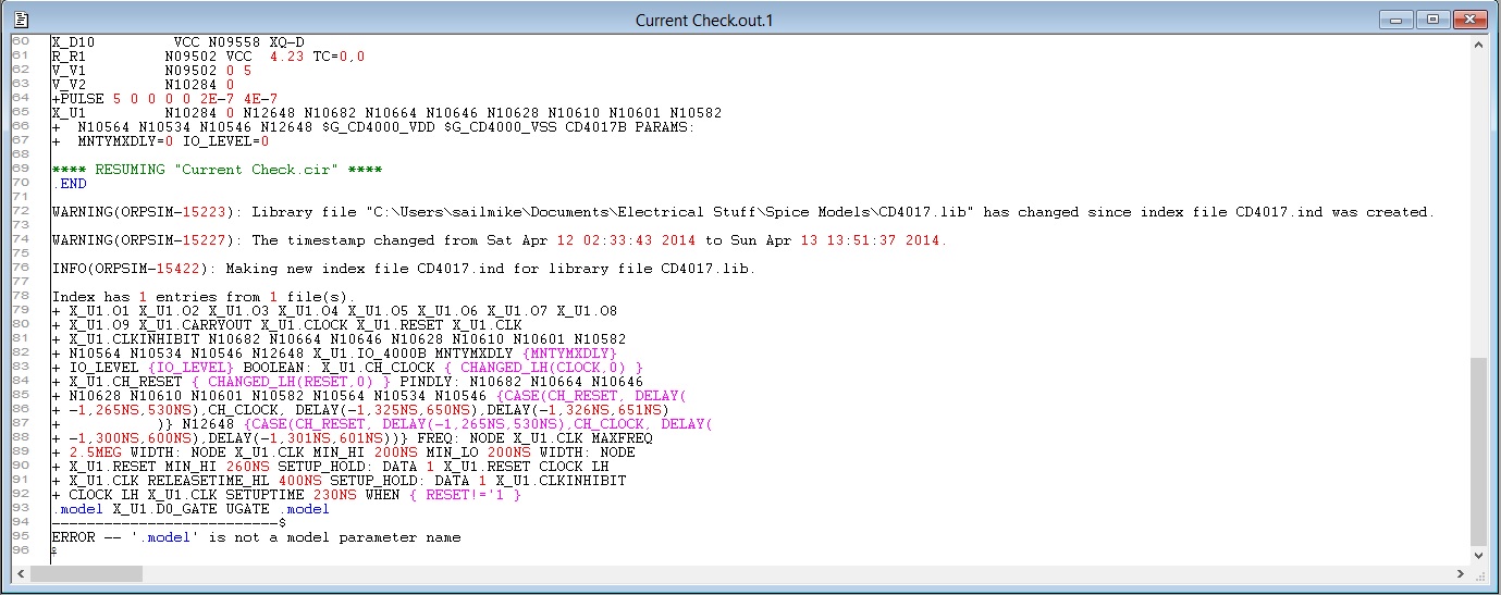 4017 model included in this POST refer to IO models and these models are not included, hence this error. Generally this happens if you try to pull out one model from a set of library and all referred models are not included in new library. Here are the missing IO models. You should include these as well in your new library to get rid of above error. .model D0_GATE ugate ().model IO_4000B_ST uio (