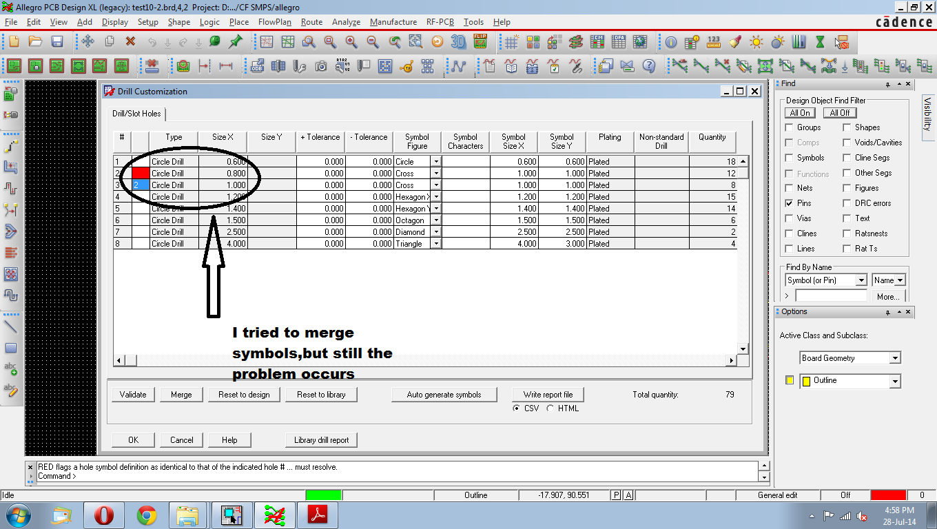 The drill size of (0.8) to (1) the size is get  varied in the design . It had been get edited in the design, But when i am try to merge it in the drill customization, that time it get error that to resolve (RED COLOR). But the Symbol padstack size and symbols are get updated in board file.