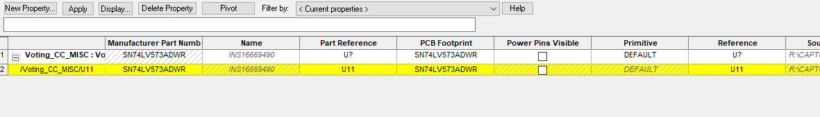 I inherited this design from another engineer and I notice something odd when I go into the part properties.  I get the normal stuff but then there is an extra bar of information below that that is highlighted in yellow.  I don't know what this means but I notice that the refdes for one is U? and the other is U11.  Maybe this has something to do with it?  Thank  you for any suggestions!