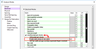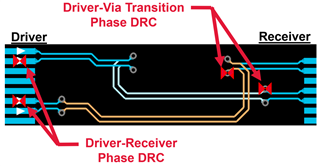 • Default Static Phase DRC calculates the phase length from the Receiver Pins back to its designated Driver Pins. When the static phase constraint value is exceeds a DRC marker is reported at the Driver Pin. A new optional behavior will now perform the static phase length calculations from each differential pair via transition back to its designated Driver Pins, and report a DRC marker when the constraint value is exceeded.