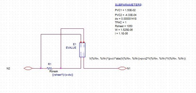 I have implemented a non-linear resistor via a heirarchical block using analog behavioral modelling. I added a subparam property named Rsheet which affects the resistance.