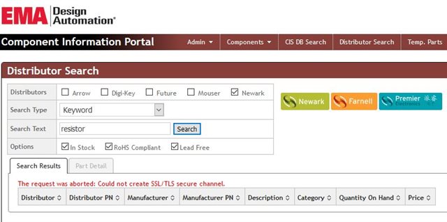 when I try to search in Distributor for some distributors I encounter errors. For digikey the error is "Invalid Partner Information", for Newark "The request was aborted: could not create SSL/TLS secure channel." and Arrow simply does not respond. The CIP version is 4.3. Does anybody some idea?