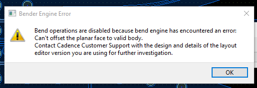 That's a very small radius (0.3mm in my country) so not sure you would actually see a bend, try increasing the radius to something larger and see if that helps. If it doesn't, as the message says I would the design and steps to Cadence Online Support http://support.cadence.com or your Cadence Channel Partner and let them investigate this further.