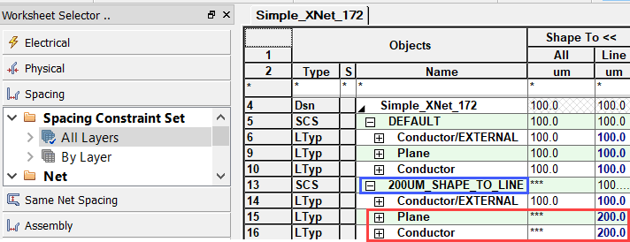 • In Spacing CSet "200UM_SHAPE_TO_LINE", enter 200um for Shape to Line on Conductor and Plane Layer Types and 100um on Conductor/EXTERNAL Layer Type