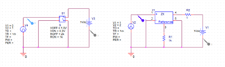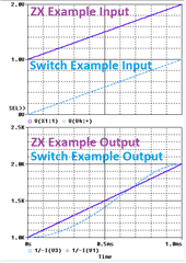 I am trying to understand the math relationship for the input variables on the S switch in Cadence PSpice (Voff, Von, Roff, Ron).  I initially thought the relationship would be linear but that is not the case based on the example simulation.  For this simple example, I am trying to simulate a resistance from 1k ohms to 2k ohms.  Using the ZX block I obtain a linear ramp as I expect.  Using the S switch it looks more like an exponential ramp.  Ultimately my problem requires a linear ramp and not exponential, but I'm trying to understand what is going on with the S switch anyway.  If I don't understand the S switch math I will probably never use it in the future.  I would prefer the S switch over the ZX block in my application as the risk of 0V or negative voltage applied to the input of the ZX block is possible, and it's an added step to make sure the simulation is built properly.  The S switch would be simpler if I could get it to work.