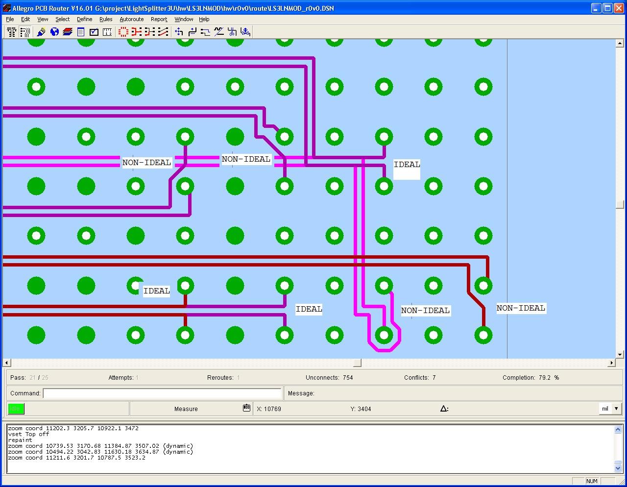 Hi All, I'm hoping someone can help me to better control my differential pair routing. As some background, our boards typically contain 200+ differential pairs running at 2.5 Gbps. We typically fanout by hand all differential pairs from BGA land patterns or SMT pads and constain the router to route the pairs on mid layers only, using no vias. Crosstalk rules also apply here. Because of the high frequency content of these signals, we go through great pains post-route to ensure that the pairs are clean and coupled to the greatest extent possible. This involves ensuring that as the pairs enter the mid layer and begin their coupling that both legs exit the via pair and come directly together with the shortest length possible. The IDEAL routes are shown in the attached image. We're running v16.01 of the Allegro Autorouter and we always have great difficulty in controlling the endpoints of the differential pair. No matter how I constain it, a good number of pairs do not quickly come together but seem to do crazy things at the endpoints. See the NON-IDEAL routes in the attached image. I am wondering if anyone in the forum has experienced this and what cures they have if any. When dealing with boards of at least 200+ pairs, the misbehaviour of the router leads to tons of post-route cleanup time. Getting the router to produce clean routes all the time would greatly reduce our clean-up time not to mention decrease my headache size. Typical Pair Definition includes the following commands: define (pair (nets FPGA_LOCAL_19.44MHZ_P FPGA_LOCAL_19.44MHZ_N (gap 4.4))) define (class FPGA_LOCAL_19.44MHZ FPGA_LOCAL_19.44MHZ_P FPGA_LOCAL_19.44MHZ_N) circuit class FPGA_LOCAL_19.44MHZ (match_net_length on (tolerance 100)) rule class FPGA_LOCAL_19.44MHZ (width 3.6) rule class FPGA_LOCAL_19.44MHZ (max_total_vias 0) circuit class FPGA_LOCAL_19.44MHZ (use_layer Mid2 Mid3 Mid4 Mid5) rule class FPGA_LOCAL_19.44MHZ (max_uncoupled_length 0) rule class FPGA_LOCAL_19.44MHZ (min_line_spacing 4.4) rule class FPGA_LOCAL_19.44MHZ (edge_coupled_tolerance_minus 0) rule class FPGA_LOCAL_19.44MHZ (edge_coupled_tolerance_plus 0) rule class FPGA_LOCAL_19.44MHZ (neck_down_width 3.6) rule class FPGA_LOCAL_19.44MHZ (neck_down_gap 4.4) rule class FPGA_LOCAL_19.44MHZ (diffpair_line_width 3.6) rule class FPGA_LOCAL_19.44MHZ (edge_primary_gap 4.4) rule class FPGA_LOCAL_19.44MHZ (ignore_gather_length on) Thanks in advance for your thoughts, Chuck Remaley Design Engineer WMI, Inc.